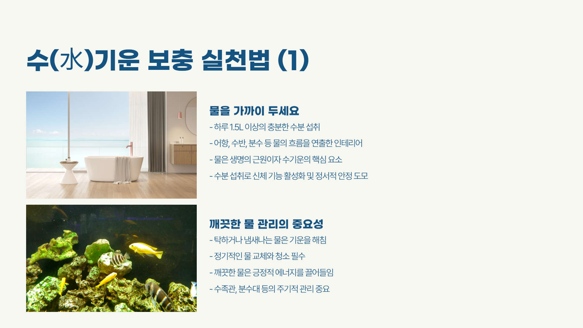 수기운은 풍수에서 '짠맛'의 기운과 연결됩니다. 다음과 같은 방법으로 수기운을 자연스럽게 끌어올릴 수 있습니다.